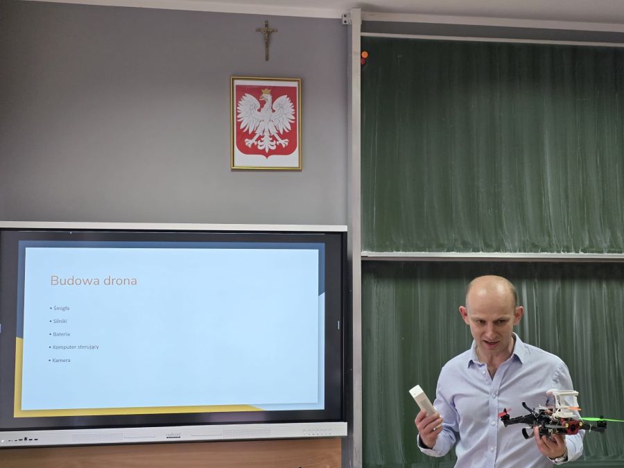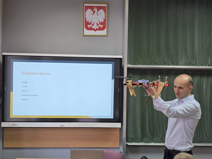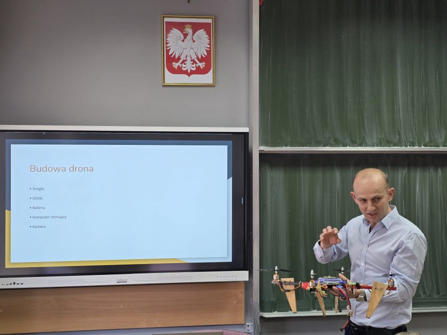 Zajęcia przeprowadził znakomity programista i pasjonat dronów – pan Maciej Urbanowicz, który z dużym zaangażowaniem opowiadał o swojej pracy i zainteresowaniach. Uczniowie mogli zobaczyć drona z bliska oraz dowiedzieć się, jakie możliwości daje wykorzystanie takich urządzeń w praktyce.