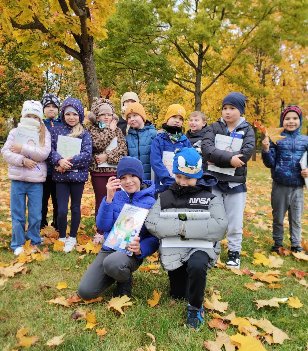Uczniowie wybrali się na poszukiwanie jesieni — tej ukrytej między drzewami, zaklętej w kolorowych liściach i cichutko szeleszczącej pod butami. W złotej, ciepłej scenerii