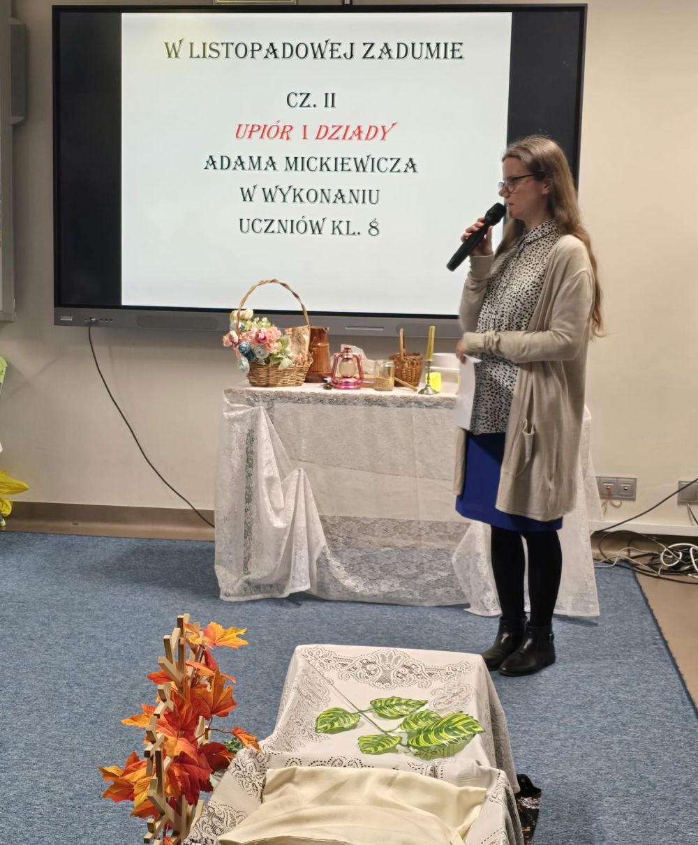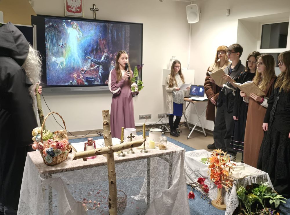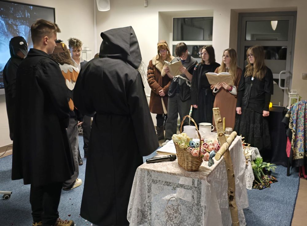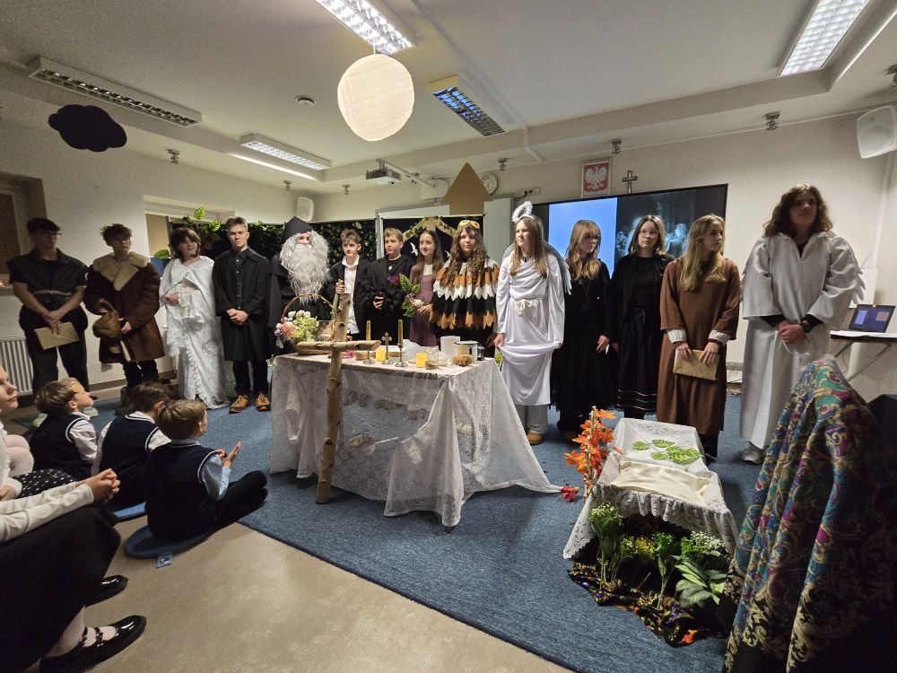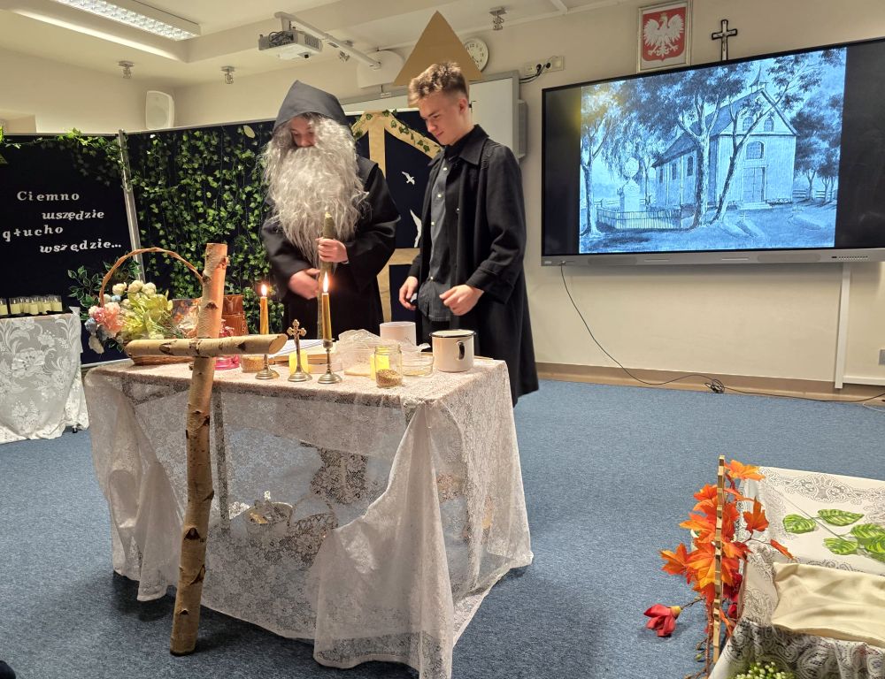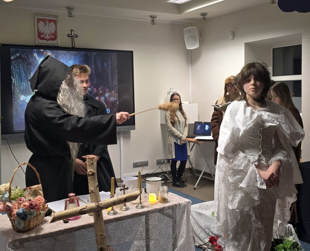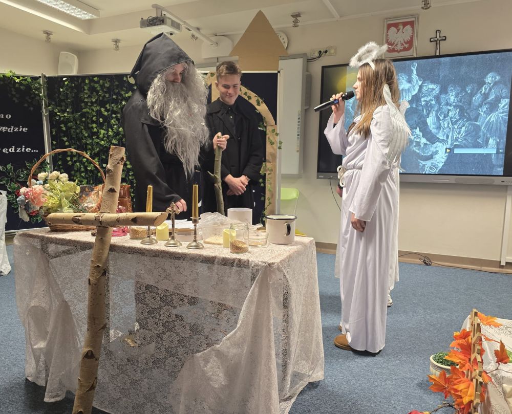 Następnie teatralna cisza ogarnęła widownię podczas spektaklu „Dziady” cz. II Adama Mickiewicza w wykonaniu uczniów klasy 8 – mistycznego spotkania żywych z duchami, gdzie granica między światami staje się krucha jak jesienne liście.